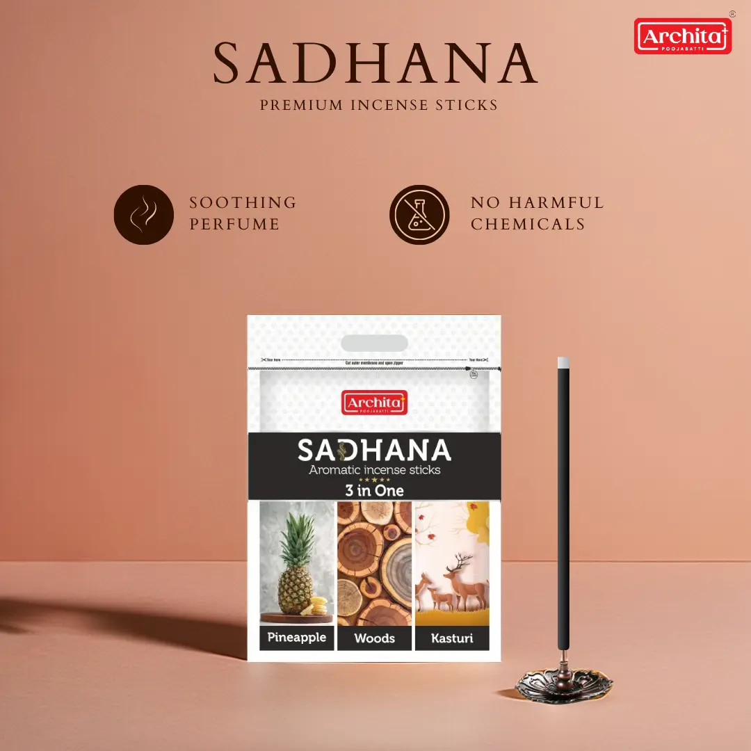 Archita Poojabatti is offering Sadhana 3 in One (Pineapple, Woods, Kasturi), a fascinating blend that surpasses conventional scent and offers an intimate link to the core essence of nature. Each stick offers appreciation to the unadulterated effect inherent in nature’s blessings with its vibrant Pineapple Woods Kasturi fragrances. Create an area of refuge in your surroundings that nurtures your spirit and your senses.