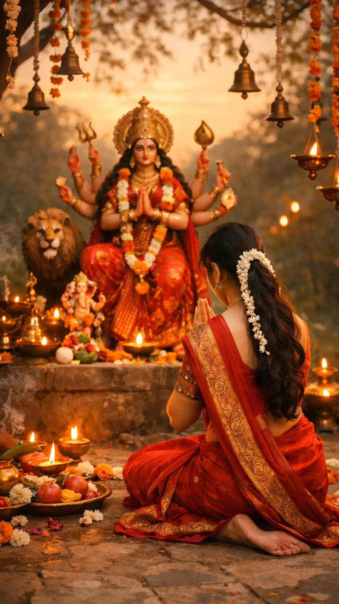 Offer flowers, diya, and sincere thanks for Maa Durga's blessings along with prayers.