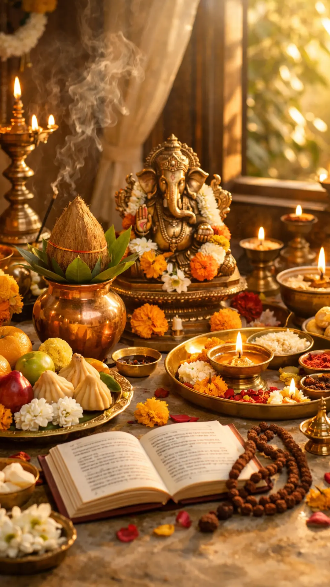 Clean the pooja area, light a diya, and offer fresh flowers to create a calm and sacred atmosphere.