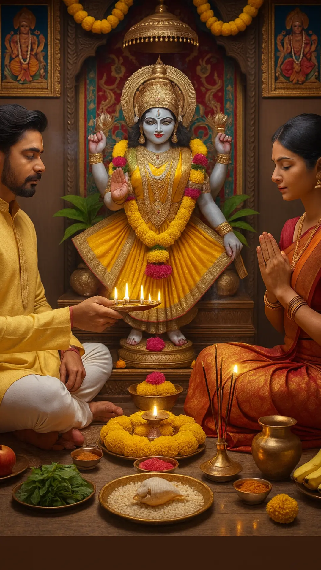 Offer yellow flowers, tulsi, fruits, panchamrit, and sattvik incense. Read Ekadashi Vrat Katha to complete the puja.
