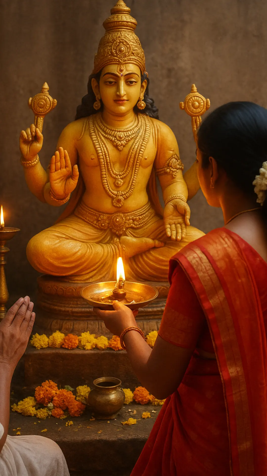 Lighting ghee diyas and offering tulsi leaves to Lord Vishnu symbolizes gratitude and invokes divine abundance and harmony.