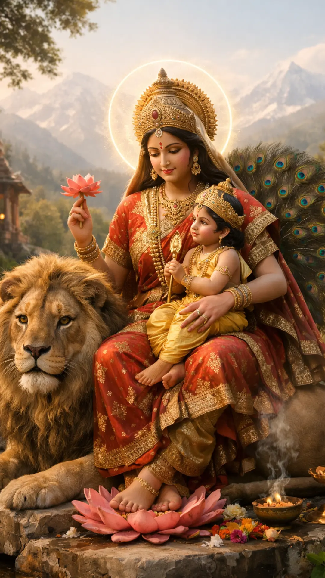 She demonstrates that genuine power also stems from compassion by holding her infant while perched on a lion.