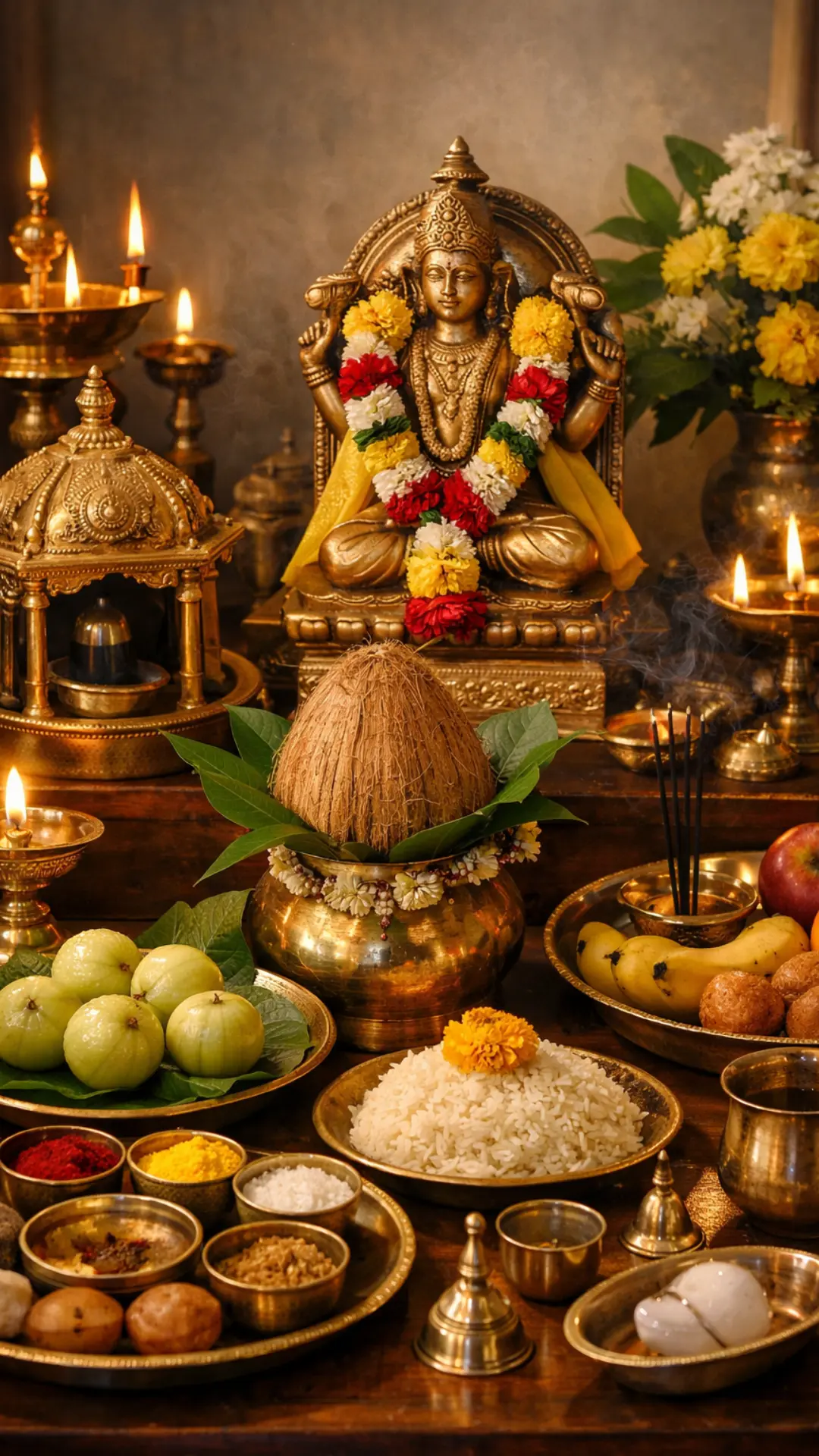 Put an idol or picture of Lord Vishnu there. Prepare water, flowers, fruits, tulsi leaves, and a diya.
