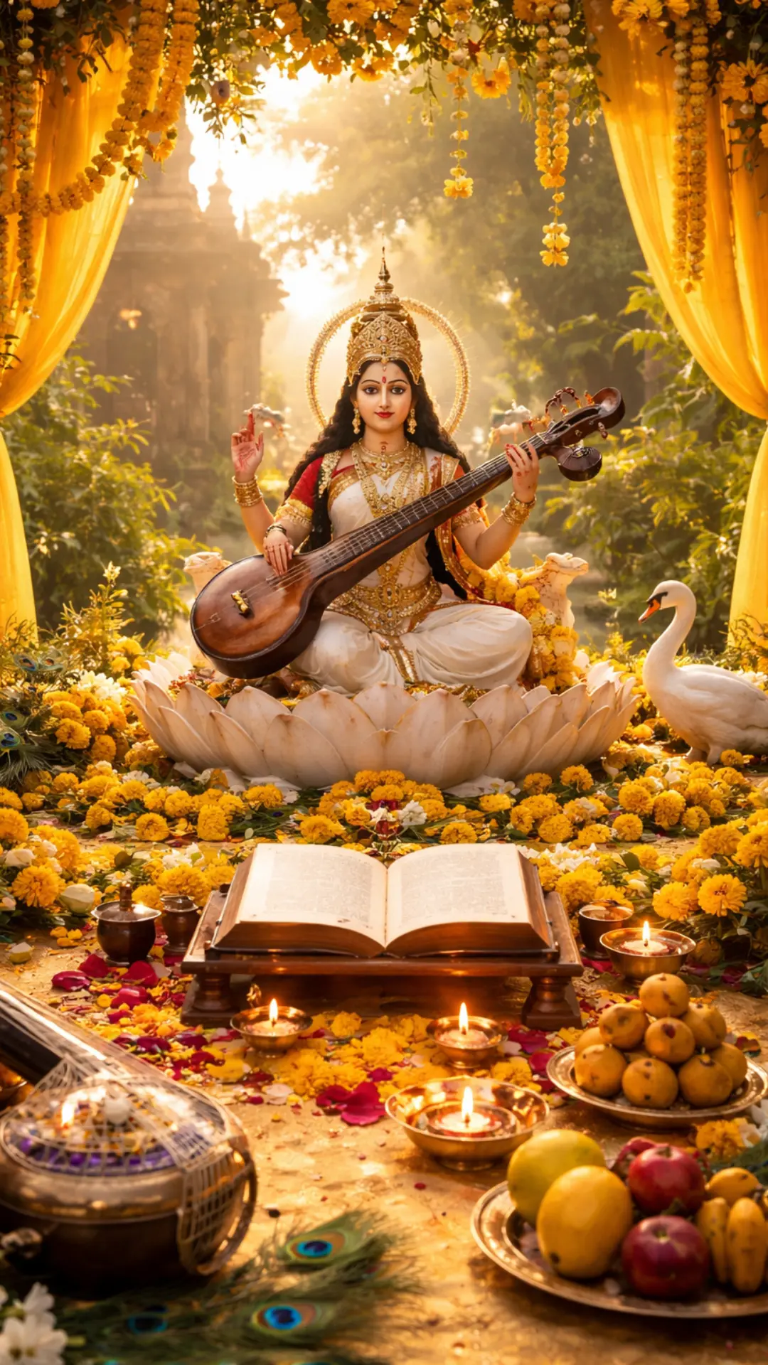 Devotees worship Maa Saraswati, seeking blessings of knowledge, learning, and artistic expression.